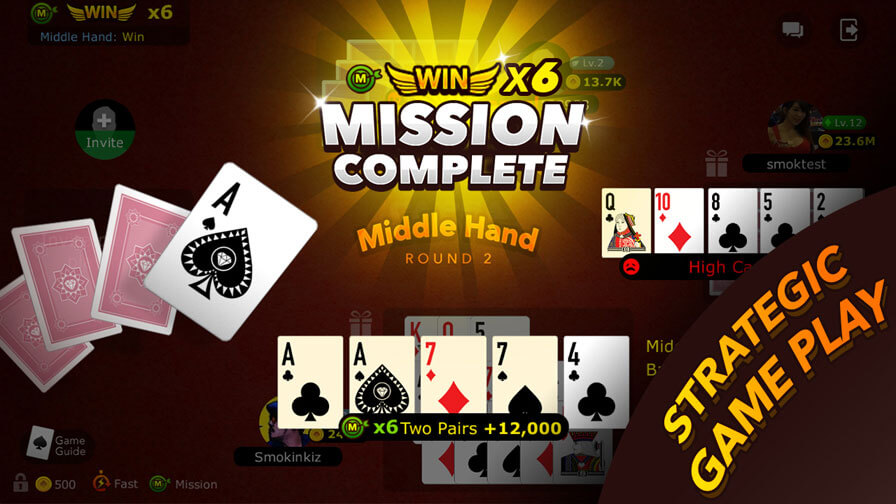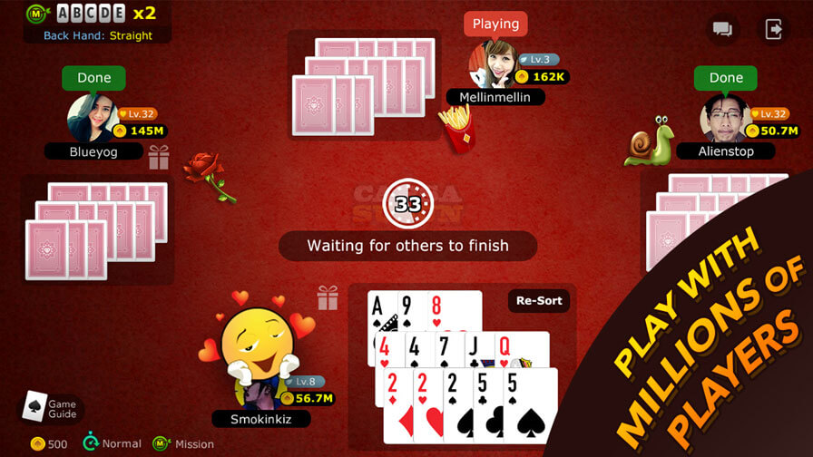 Capsa susun (or commonly called as Chinese Poker) is Asia's traditional Card game. The player needs to make 3 lines with 13 cards. (5 cards for Back-hand / Middle-hand and 3 cards for front-hand) and compare each line with other players. Rule is simple, however, you need to make a speedy decision with stategic thought.